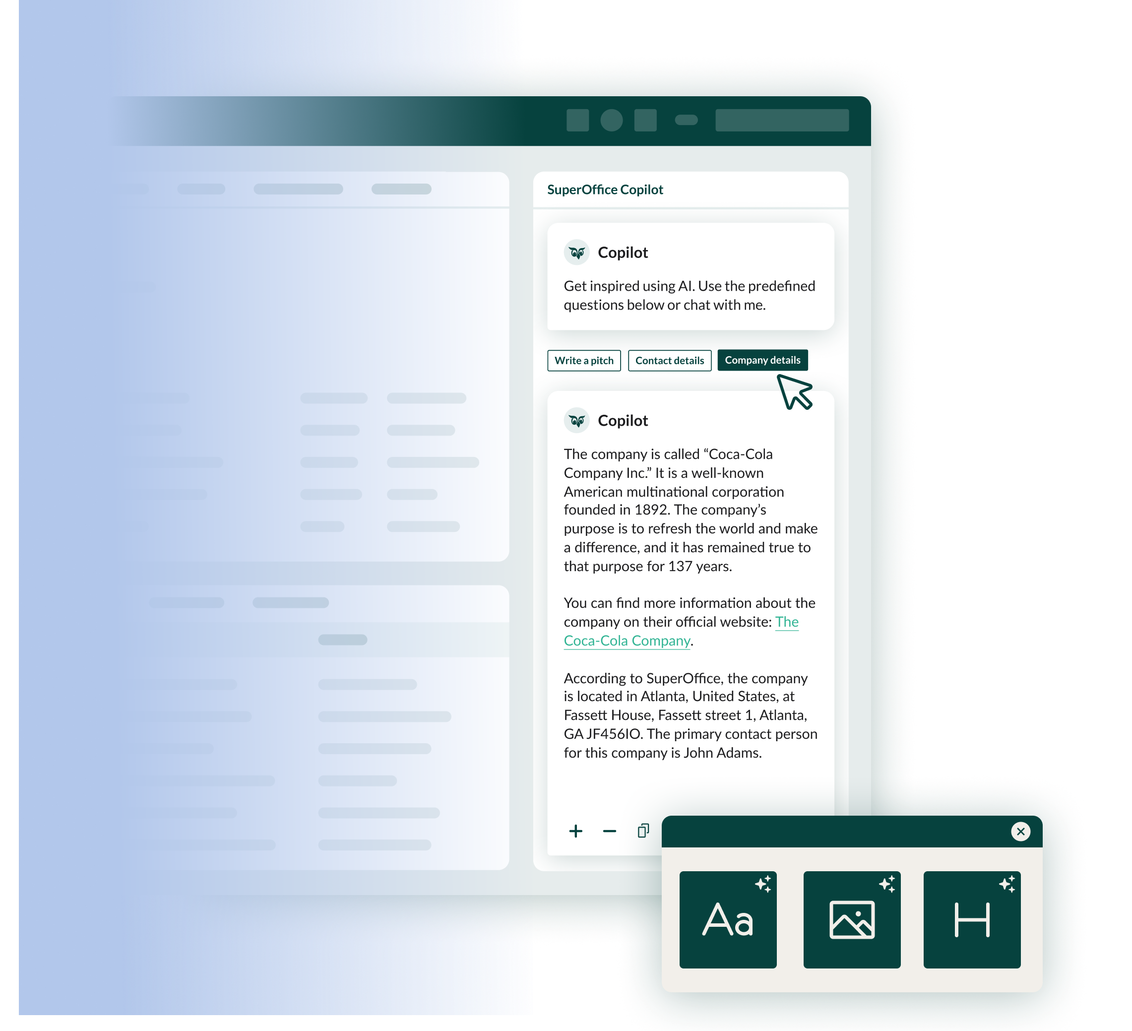 Ontvang een overzicht van verzoeken en van je agenda. Krijg inzicht in alle CRM-data in enkele seconden. Genereer gepersonaliseerde voorstellen, pitches en aangepaste campagne afbeeldingen. Het is nog nooit zo eenvoudig geweest om sterkere relaties op te bouwen - met behulp van AI in SuperOffice CRM.