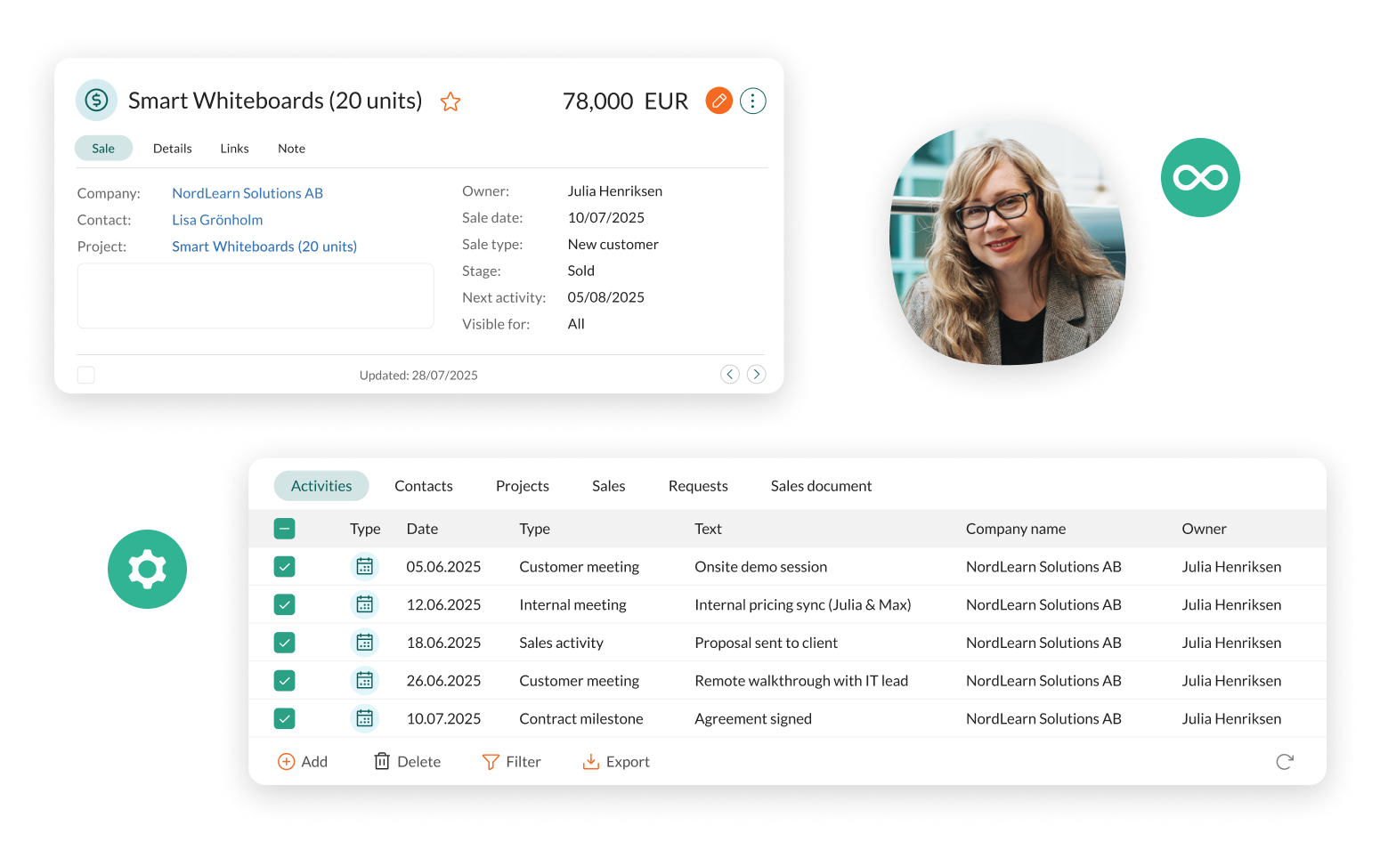 - Een volledig overzicht van klantinformatie, zoals contactgegevens, e-mailcorrespondentie, telefoongesprekken, documenten, verkoopgegevens of notulen van vergaderingen