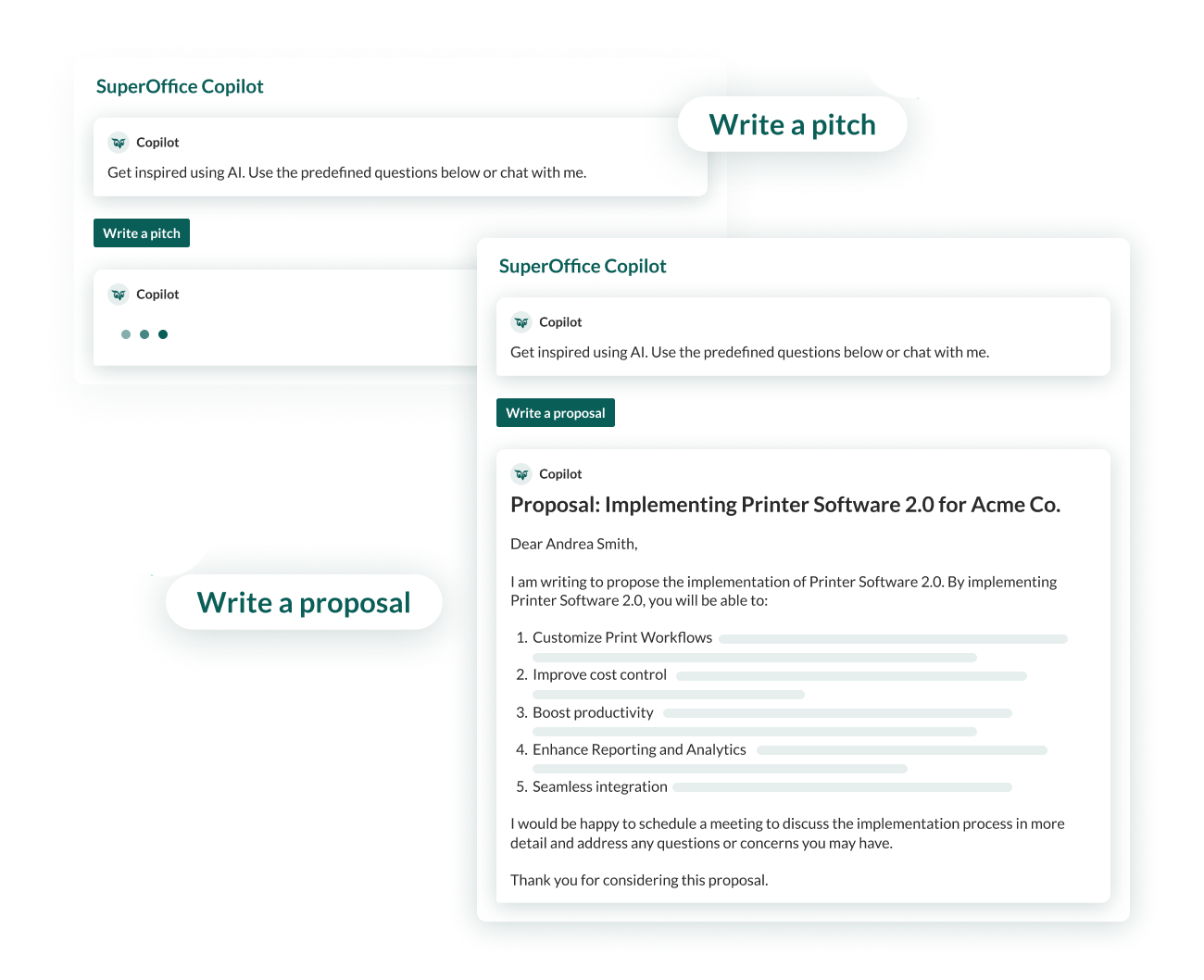 - Begin direct met schrijven met SuperOffice Copilot, waarbij je je eigen ideeën combineert met verfrissende perspectieven