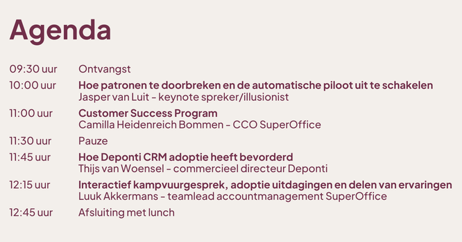 Tijdens het SuperOffice seminar op donderdag 21 mei staat adoptie van CRM als veranderproces centraal. In inspirerende en interactieve sessies ontdek je hoe je mensen meeneemt in verandering en hoe adoptie leidt tot blijvend resultaat.